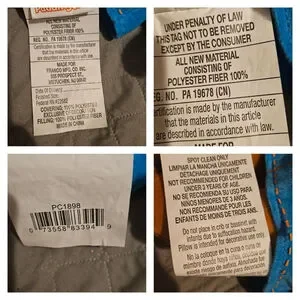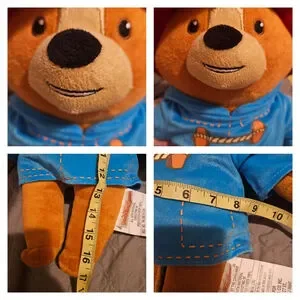 This is a pre-owned Paddington Bear plush toy. It features a brown bear wearing a red hat and a blue coat with toggle closures. The toy is made of polyester fiber. The item is in good preowned condition with no visible imperfections.