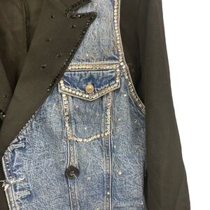 Geously black Denim mixed media Fray Hem Stud Blazer Concert DIY Jacket Med "P"