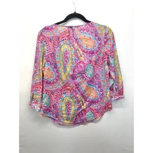 The Lauren Ralph Lauren Petite Blouse in Pink Paisley is a stylish and lightweight top perfect for casual or travel occasions. Made from 100% cotton, it features a round neck, long sleeves with casual ruffle accents, and a pullover closure. The blouse is designed for petites with a regular fit and is ideal for the summer, fall, and spring seasons. In a multicolor paisley pattern, this top embodies a bohemian, teacher, and tropical theme, adding a touch of preppy chic to your wardrobe.