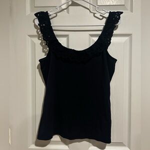 This elegant black top features a delicate lace trim, perfect for adding a touch of sophistication to any outfit. Ideal for both casual and formal occasions.