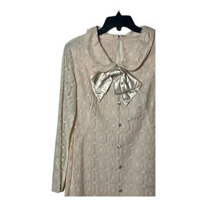 DETAILS: MIDI LENGTH; PETER PAN COLLAR WITH BOW AROUND THE NECKLINE; LACE; FULLY LINED; LONG SLEEVES; SLEEVES ARE SHEER; FAUX BUTTON DOWN THE. FRONT; MID WEIGHT