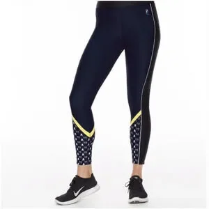 P.E Nation X Soulcycle Side To Side Skull Leggings in a black/navy/white/gold coloring ft. a skinny fit with skull print detail at hems, yellow vertical stripe details on each lower leg, white cord seam detail, small hidden PE logo on front, thick waistband, mid rise fit