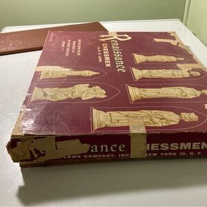 Vintage 1959 ES Lowe Renaissance Chessmen Chess Set Complete w/ Board. Box in really bad shape & a few chess pieces missing felt bottoms. Very old set. King piece 4” & pawns 2 1/2”