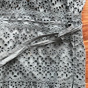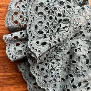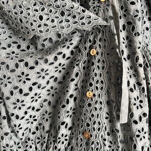 Elegant blue midi dress with ruffle sleeves. Intricate eyelet detailing. Beautiful teal color (Atlantic) with gold buttons. True to size. Top is unlined, bottom is fully lined.