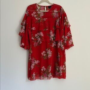 Vibrant flounce dress with floral design. Features ruffle details and key hole back. Versatile style, ideal for a variety of occasions. EUC