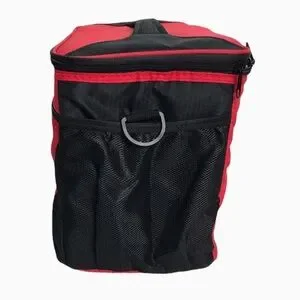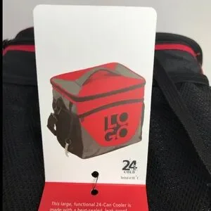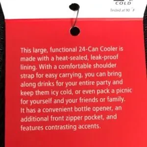 This functional 24 can cooler is a practical size for any outing. It is made with a heat-sealed, leak-proof lining to help keep your snacks or drinks icy cold. Holds ice for 24 hours. It has a zipper dry pocket on the front and a mesh pocket on each side. Use the handle on the lid or the detachable shoulder strap. An attached metal bottle opener is also located on the side. The two-color design features a logo on the front.
