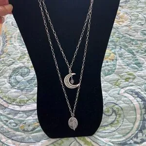 Elegant silver layered necklace featuring a moon and quartz pendant. Perfect for adding a touch of sophistication to any outfit.