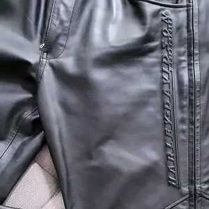 Classic black leather pants with iconic Harley-Davidson branding. Heavy leather with logo down the side. Buttons at ankles and back pockets. See pictures for slight scuff on back right behind.