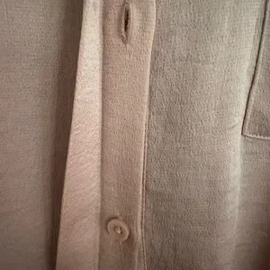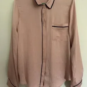 Chic blush rose smoke pajama top with black piping. Button-down style. Features a front pocket.