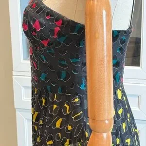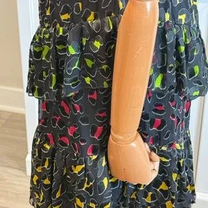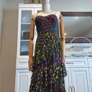 This stunning Alice + Olivia “Luella” Maxi Dress features an asymmetrical tiered ruffle skirt, soft sweetheart neckline, and colorful abstract print layered over sheer black mesh. A true statement piece that moves beautifully and photographs even better.