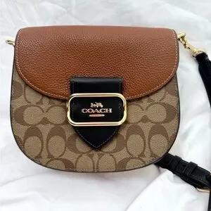 Chic Coach Morgan crossbody with signature pattern. Tan and black design. Gold-tone accents for a luxurious touch.
