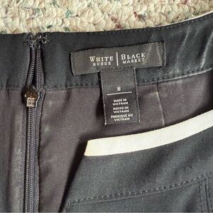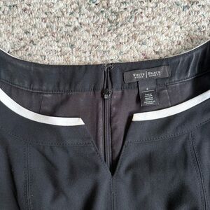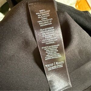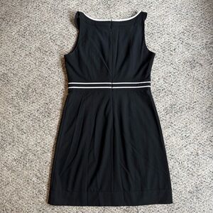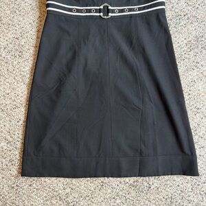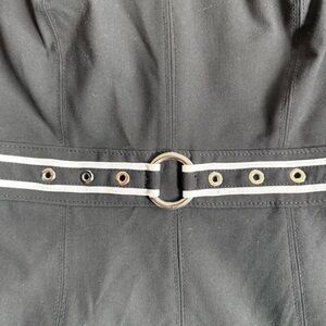 Elegant black mini dress with white accents. Features a sleek belt detail. Ideal for versatile styling. Minor signs of wear, some discoloration along sleeve/inner neck. See photos for condition.
