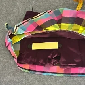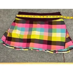 • Multicolor plaid print with deep plum waistband • Built-in shorts with side pocket • Pleated layered back design for extra flair • Zippered back pocket for essentials • Logo at waistband