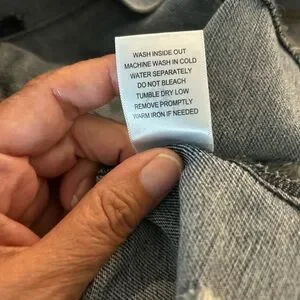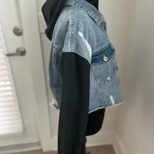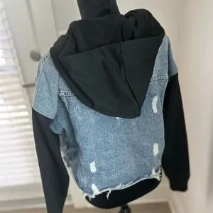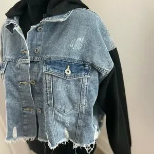 Stylish denim jacket with distressed details. Features a black hood and frayed hem. Perfect for casual wear.
