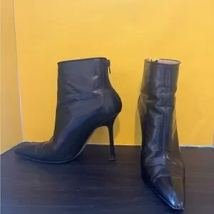 Elegant black leather boots with a sleek pointed toe. Perfect for elevating any outfit.