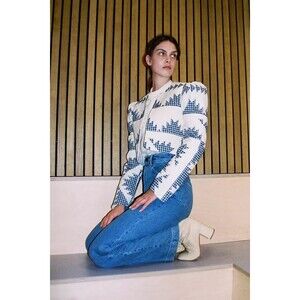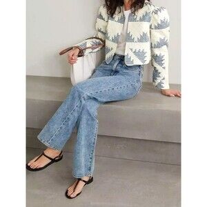 Caroline Constas women White & Navy Linen Blend Quilted Blazer Jacket size Large