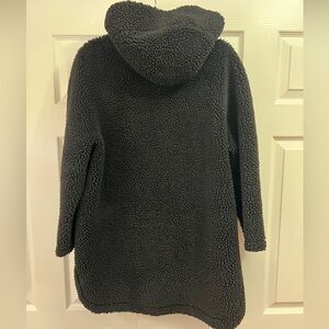 Chic and cozy black teddy jacket. Perfect for layering. Soft faux fur texture. You will love to have it. Cozy, warm and so so soft. Two large frontal pockets. Slit sides, little longer in the back. Full zipper closure, hooded. Oversized . Very good condition