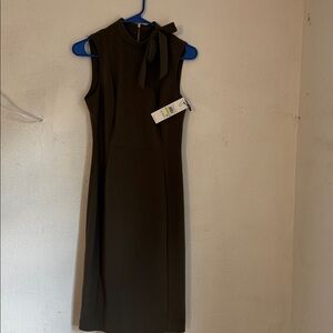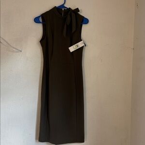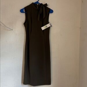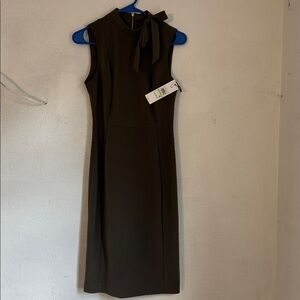 Calvin Klein olive green sleeveless dress size 4. Chic olive midi dress by Calvin Klein. Features a stylish bow detail at the neckline. Perfect for versatile wear.