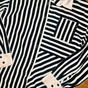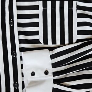 Elegant button-down with bold black and white stripes. Features a stylish pocket detail. Ideal for versatile wear.