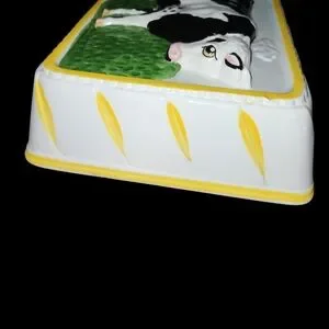Charming ceramic hand painted wall decor/jello mold by Sigma Beauty. Features a smooth white, yellow,black,and white shiny glazed finish. Raised cow design. Vintage. Excellent condition. Andrea West for Sigma Taste Setter. Great Farmhouse style, Cottage Style. Or if you just like cows, as I do.
