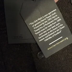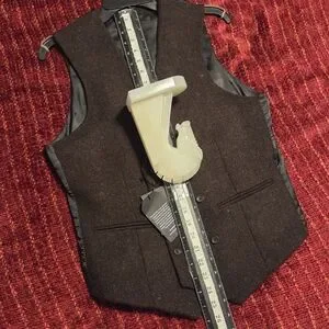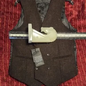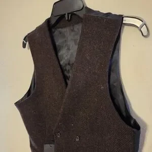 New with tags ASOS Harris Tweed men’s vest in size 38 Regular (U.S.). Crafted from 100% pure wool in a rich dark brown tone. The front features a classic Harris Tweed finish with button closure, while the back is designed with a striking black geometric triangle pattern. Fully lined for comfort. Timeless tailoring piece ideal for layering with dress shirts or under a sport coat. Measurements are provided in the photos.