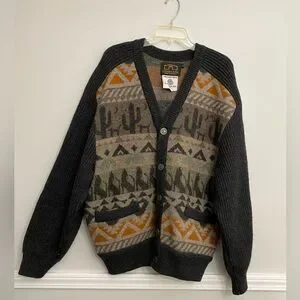 Vintage Longhouse Canada Wool Cardigan in excellent condition. This piece is gorgeous!! 100% pure virgin wool is comfortable, warm, and made to last. This piece has an amazing southwestern vibe with wolves and cactuses woven in. Metal buttons are beautiful as well.