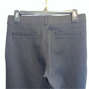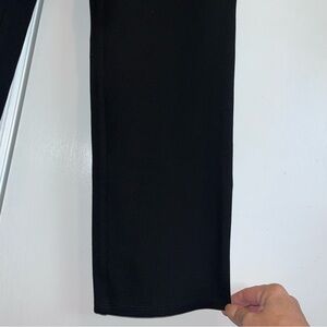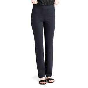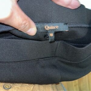 Quince Ultra Stretch Ponte Knit Classic Black Straight-Leg Pants. Pull On Sleek black straight-leg pants, with Belt Lips. Flat Wider Elastic Waist. Faux Front Hip pockets and back slit pockets. Perfect for any occasion.