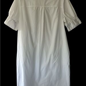 Crisp white shirt dress. Button-up front. Short sleeves. Chest pocket and hand pockets.