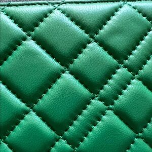 Elegant quilted wallet by Kurt Geiger. Features a vibrant emerald hue and secure zipper closure.