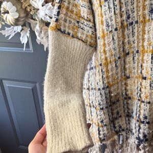 Chic plaid poncho with fringe detail. Perfect for layering.