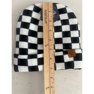 This beanie features a trendy black and white checkered pattern and is designed for kids, offering a soft, stretchy, and comfortable fit. It's made from a midweight knit fabric suitable for cooler weather.