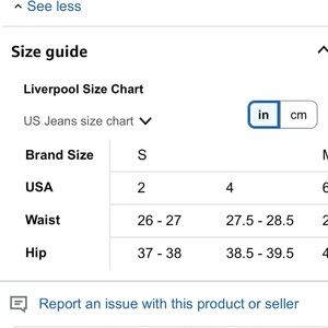 Classic indigo jeans by Liverpool. Features contrast stitching and button closure. 60% cotton, 17% polyester, 15% Lyocell. Machine washable. Worn several times with lots of life left. Comfortable and soft denim. Fast shipping from non smoking home.