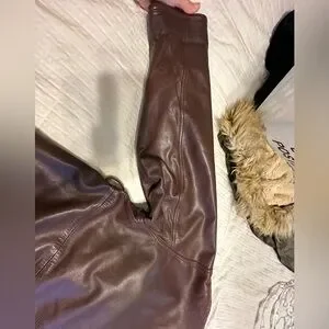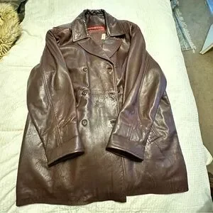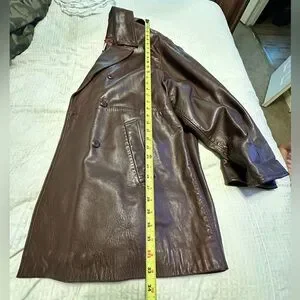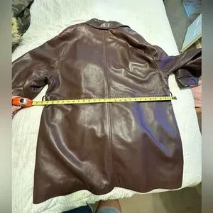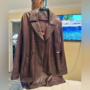 Elegant dark brown leather jacket by Coach. Features a soft interior lining. No belt. Great condition with no odor. Small scratch to lapel area is pictured