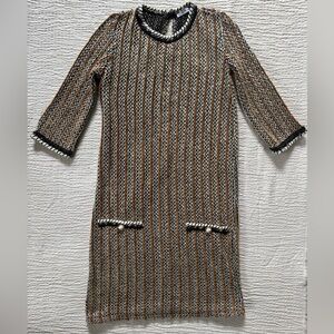 Never-worn stylish midi dress with black, white, and burnt orange stripes. Features three-quarter sleeves and decorative front pockets. Perfect for any occasion this fall!