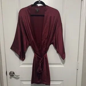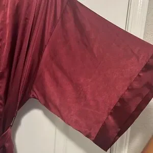 Elegant satin robe with a rich burgundy hue. Perfect for a touch of luxury in your loungewear. No pockets