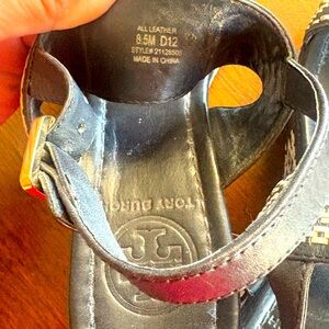 Tory Burch Reena Wedge Dark Navy and White Sandals Size Medium 8.5. Good condition, see photos. Leather is is great shape, no visible flaws.