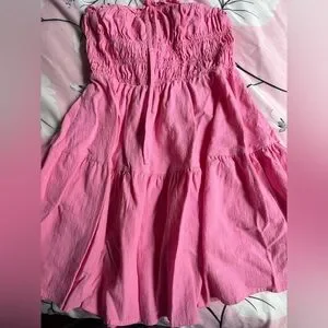 Chic pink strapless dress with a ruched bodice. Perfect for summer outings.