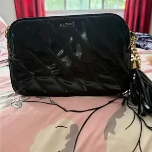 Elegant black crossbody bag by Aldo. Features glossy finish and gold chain strap. Includes stylish tassel detail.