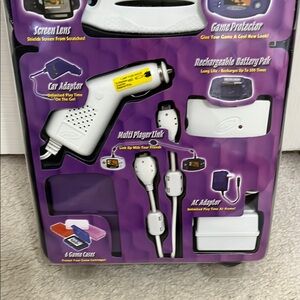 Includes carrying case, screen covers, game protector with light, magnifiers and shield, car adapter, rechargeable battery pack(not opened so has not been tested) multi-player link, AC adapter, and 6 game cases.