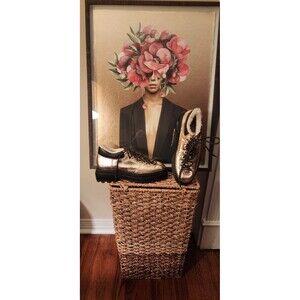 These are Schutz ankle booties in a stylish gold color with a Sherling lining and lug sole. They are a size 8 for women, featuring a trendy bootie style with a metal theme. The upper material is fabric, making them both fashionable and comfortable. STORE DISPLAY. MAY SHOW SIGNS OF SHELF WEAR.