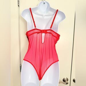 NWT Rachel Roy Red Lace Trim Floral Mesh Letter R 3 Crystal Charm Bow Bodysuit L