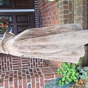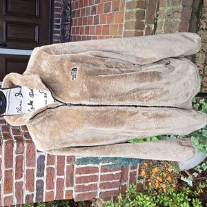 Great Condition! The North Face highly popular Full-Zip Osito Jacket tan with black trim. Super soft high pile fleece. Stand-up collar. Secure zip hand pockets. Embroidered logo on chest and back shoulder. Chest 45-48" Hips 48-51". Length 30".