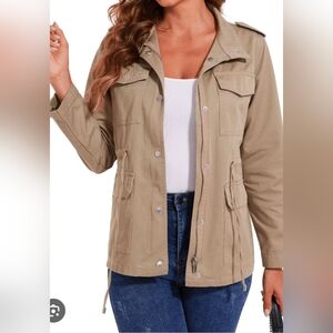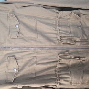 Chic khaki utility jacket by Express. Features multiple pockets and a sleek design. Ideal for layering.