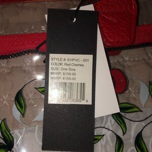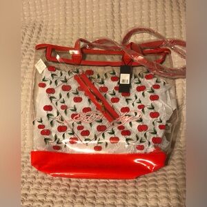 Stylish tote bag with red cherry design. Features vibrant red accents and wallet.