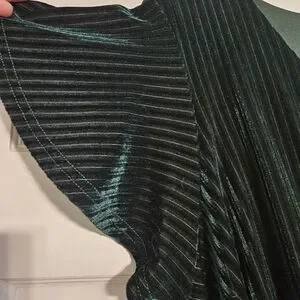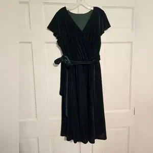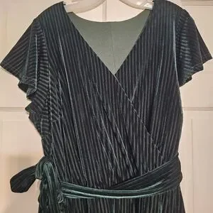 Beautiful emerald green, striped dress from ModCloth. This velvet dress is very well made. Wrap style and stretchy material. Best of all, it has pockets!