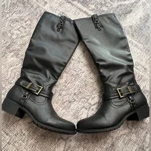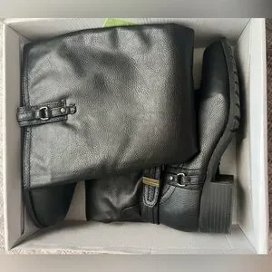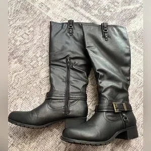 Pre-owned boots and only worn a couple of times. Chic black boots that sit just below the knee. Elegant and great for the fall outdoor weather. Versatile, can be dressed up or used for a more casual look.