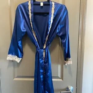 Luxurious Blue Satin Robe with Lace Accents NWOT 100% polyester feels like silk