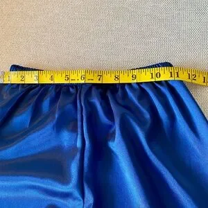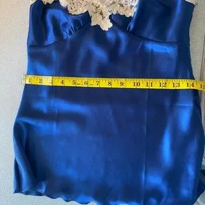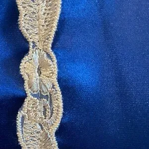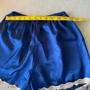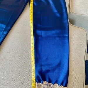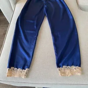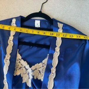 5 pieces!! Stunning blue satin robe, chemise, pants, camisole with elegant lace details. Ideal for a touch of luxury. Never worn. Sized as a M, however runs extra small XS to me. Beautiful color and details. Lace is very faint ballet pink almost off white. I would love to wear this, but I’m not that little. Great for honeymoon, resort, special occasion or just because!