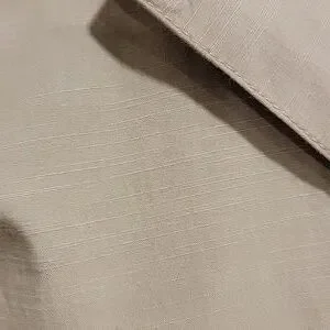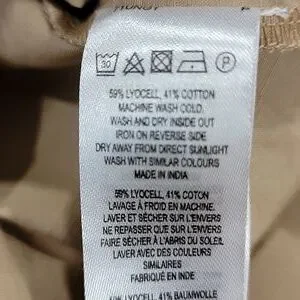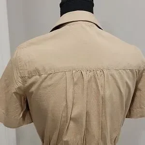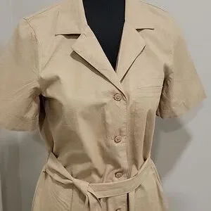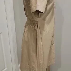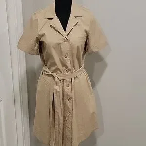 Chic tan dress with button-up design. Features short sleeves and an attached belt. Elastic waist back and button up front. Shirt tail hem.