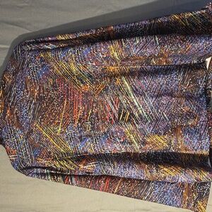 Multi colored abstract design long sleeves jacket with zip up and pockets in the front.